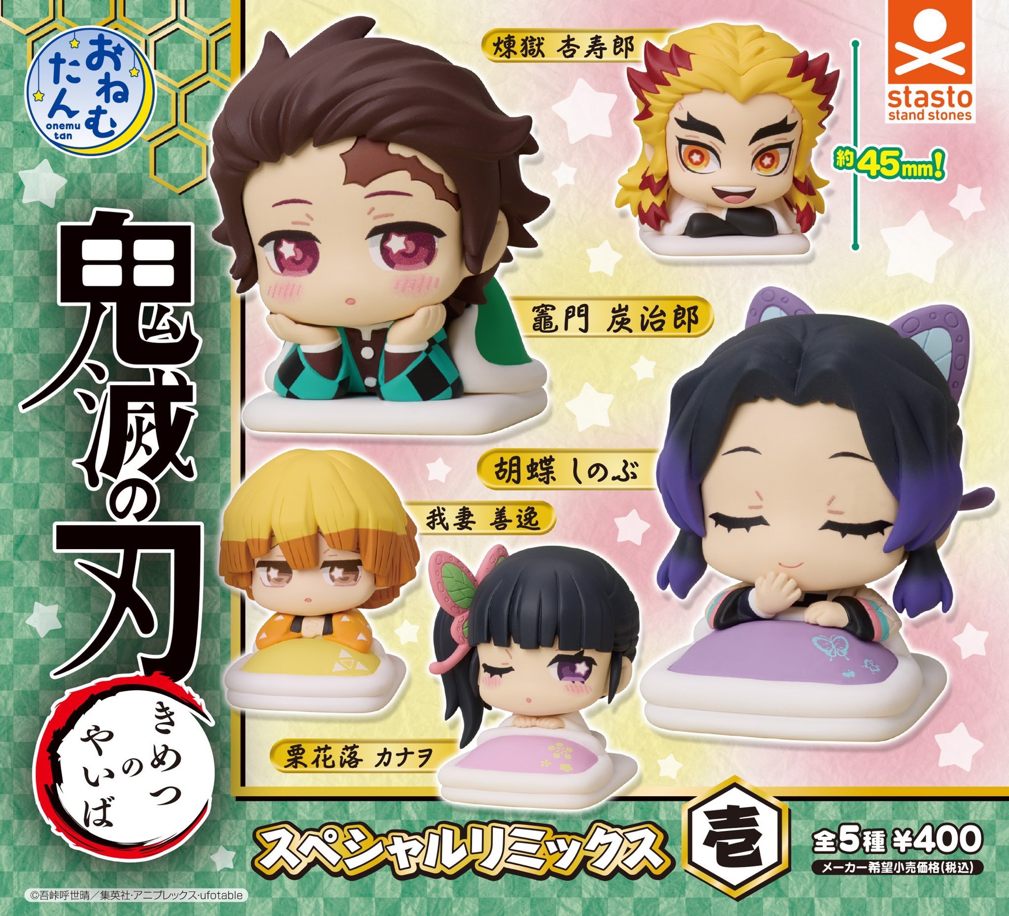 Oficiālā Demon Slayer (Kimetsu no Yaiba) Onemutan Special Remix Vol.3 sērija no Stasto Stand Stones piedāvā mīļas chibi stila figūriņas ar varoņiem, kas attēloti atpūšoties uz spilvena. Figūriņu augstums ir aptuveni 45 mm, tās ir lieliski piemērotas kolekcijai vai galda dekoram.
