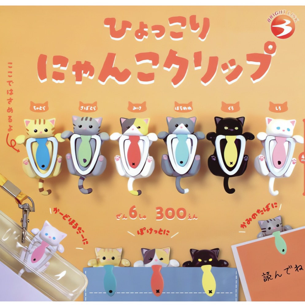 Oriģinālā Hiyokkori Nyanko Clip sērija no Bright Link piedāvā mīlīgus klipšus ar kaķīšiem, kas it kā izlien no grāmatas vai piezīmju lapas. Šie aksesuāri ir gan praktiski, gan dekoratīvi.
