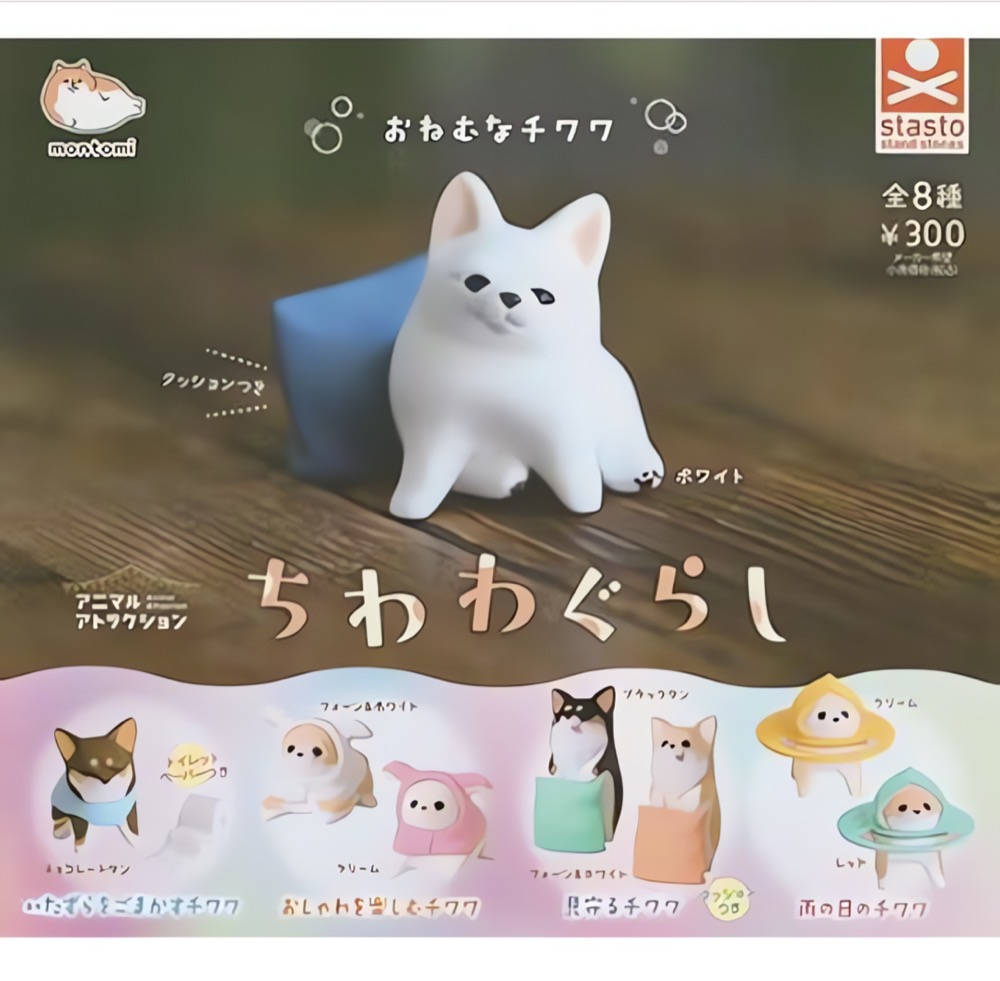 Mīlīgā Chiwa Dog Figures sērija no Stasto Stand Stones piedāvā jautras mini figūriņas ar čivavām dažādās komiskās situācijās. Katrs tēls attēlo mazo sunīti īpaši kawaii stilā.
